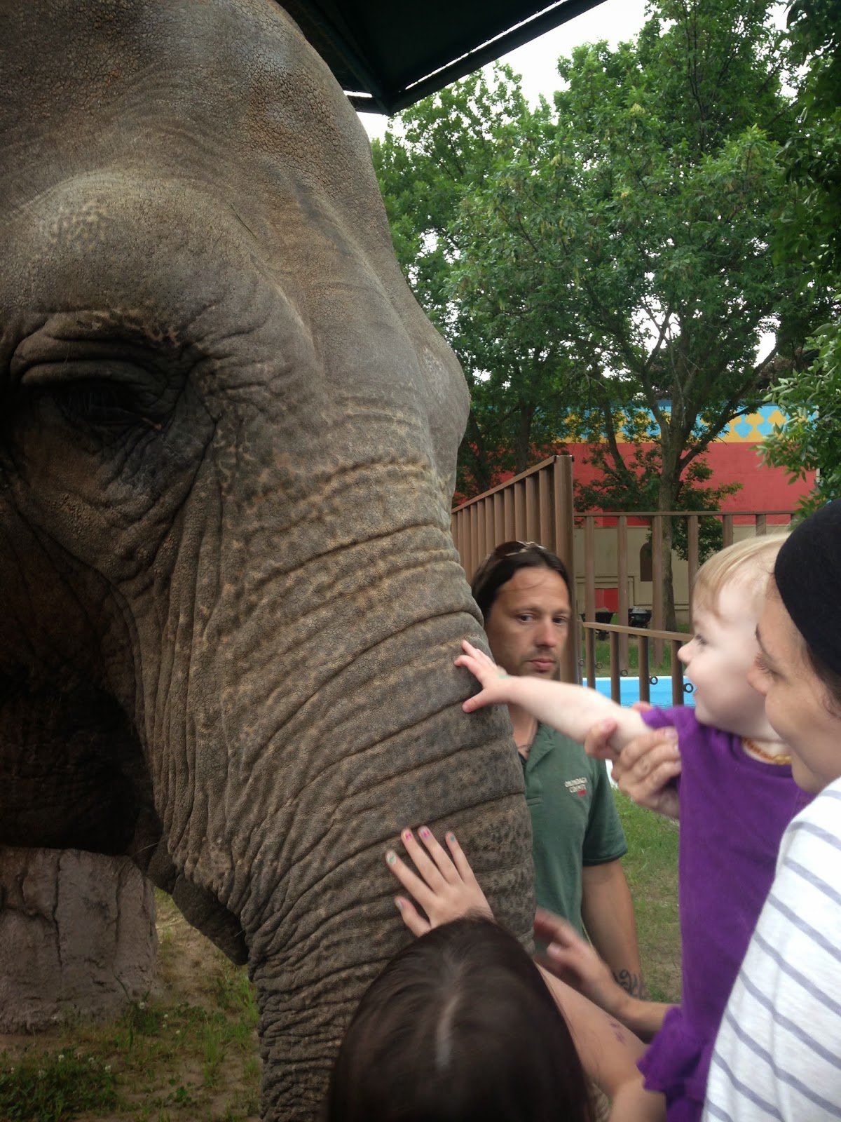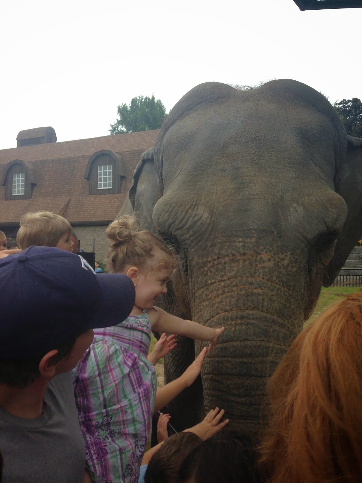 They had a penguin feeding at 6:00pm so we headed over there with our popcorn. The girls loved it! They got right up against the glass and enjoyed seeing them catch the fish. We had seen the penguins there before of course, but never during feeding. Next stop was the barn area. This is my husband’s favorite part because they have alpacas. We got to pet them and then my daughter got to learn how to milk a cow. That is one of her favorite exhibits and she is getting really good at it! At 6:30pm there was an elephant talk so we headed over to that section. My oldest really loved the elephant and kept telling me she wanted to ride on her. What a surprise when after the show they brought the elephant around and let everyone touch her. My older daughter said “She felt hard mommy!” My youngest squealed with excitement when she got to touch the elephant!
