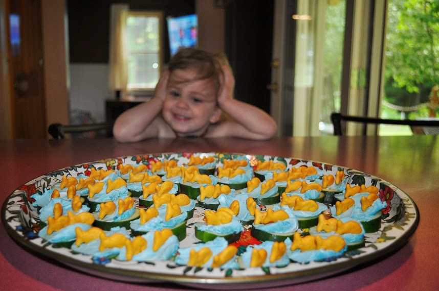I took a lot of ideas from Pinterest and from NickJr.com and we had a great day! My husband made her an “ocean” themed dress – he is so handy like that – while I worked on the snacks and decorations. I cut up cucumbers and put cream cheese on them (dyed blue to look like water), and stuck goldfish on top. These came out really cute and the kids actually loved them!